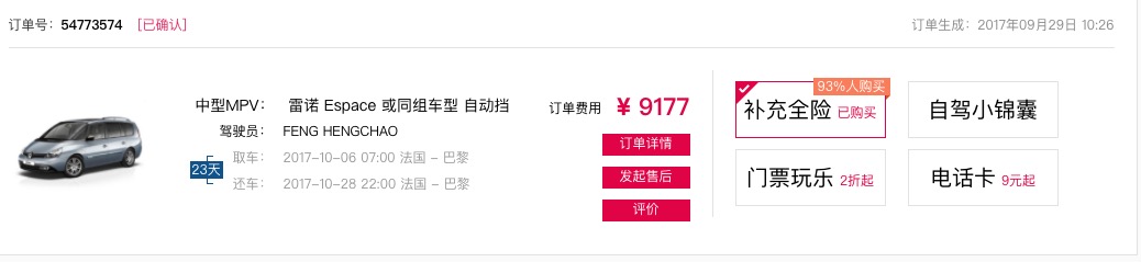 3)租车(国内某租车平台上租的,外加了1978元现场补交的保险费用)