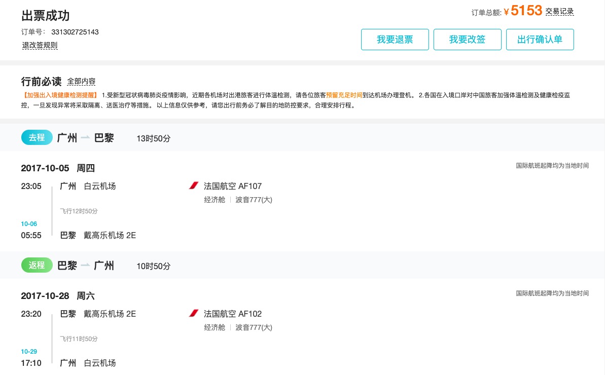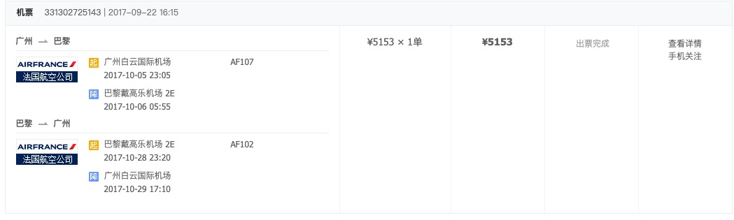1)机票:来回法国的机票不贵,经济仓一般来回几千块,这次提前了二周预定(最好再提前多点时间会便宜些,多查查)