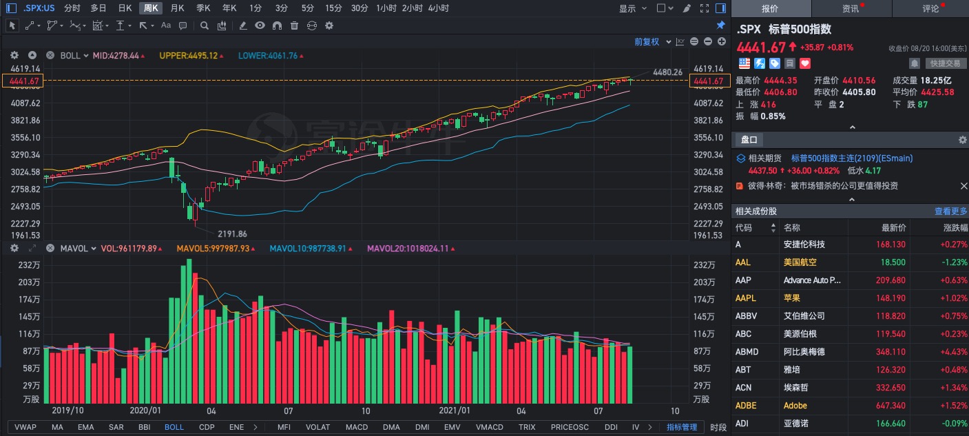 标普500指数与纳指一样,一路上涨,本周达到新高,收于4441,年内涨幅18.25%