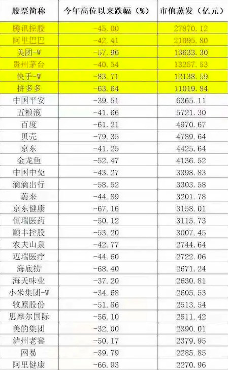 今年高位以来的涨跌幅