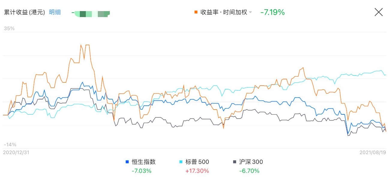 最近中概股又是一波暴跌,恒生科技指数年内高点11000点到现在的5895跌幅46%,腾迅跌幅46%,阿里巴巴跌了49%,美团跌了56%,百度跌了62%,快手跌了85%,个人富途的这个账户今年也由红变绿(下图橙色的这根),2月中达到高点,收益30%,然后经历一波下跌行情,再到6月底超越标普恒生沪深300收益20%,随后一波急下,直至今日垫底三大指数,-7.19的收益。